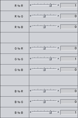 The labels should be pretty clear, R to R is Red to Red, R to G is Red to Green, etc. The filter's default values are set to display the unchanged image.